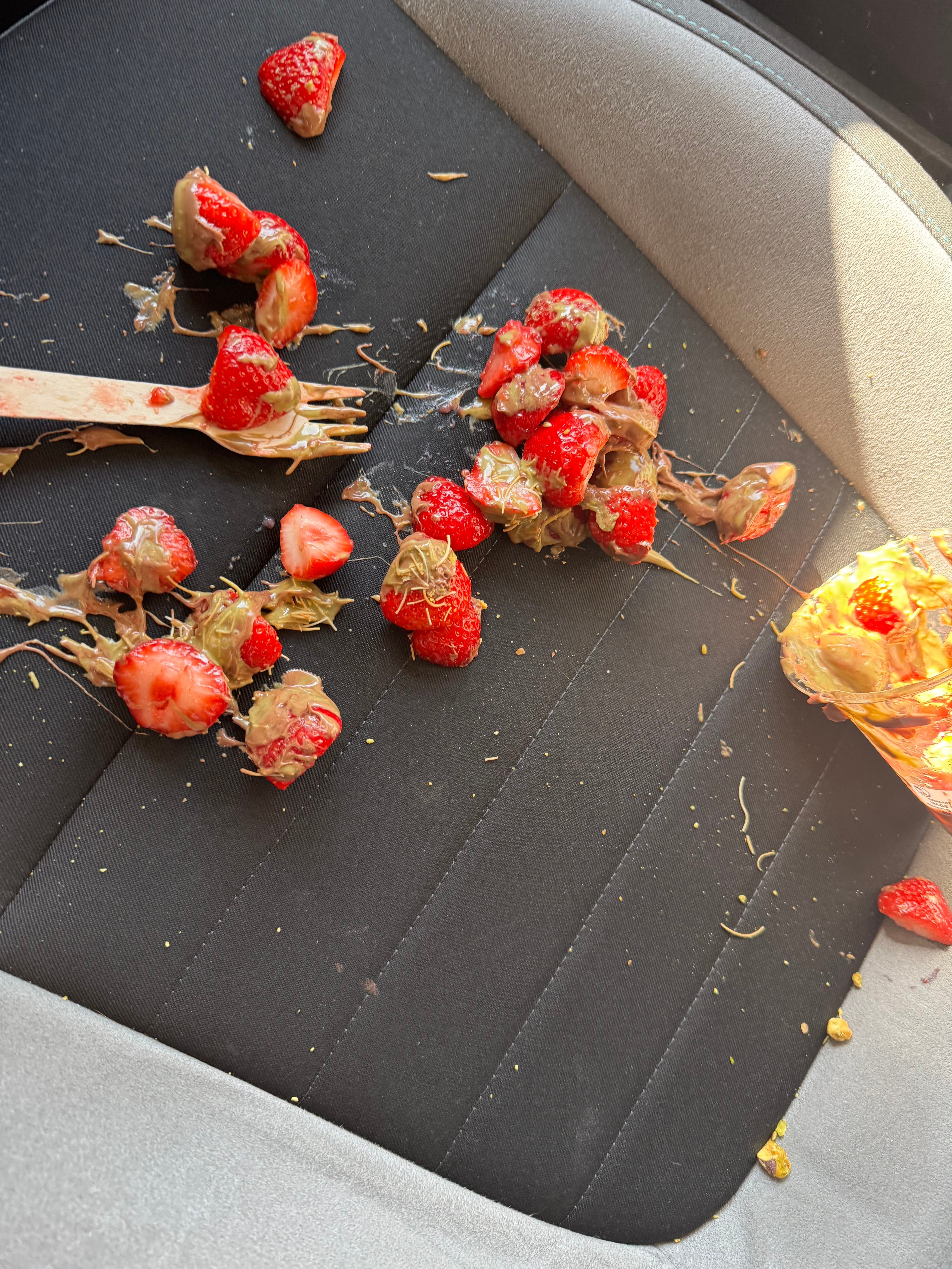 Wat ik ontzettend grappig vind, is dat een aantal weken later m’n vriend langs reed om wederom die heerlijke aardbeien te halen. De eigenaar zei: ‘Ik doe ze wel even voor je in een tasje, want pasgeleden was er een vrouw, die liet alles op haar autostoel vallen’.