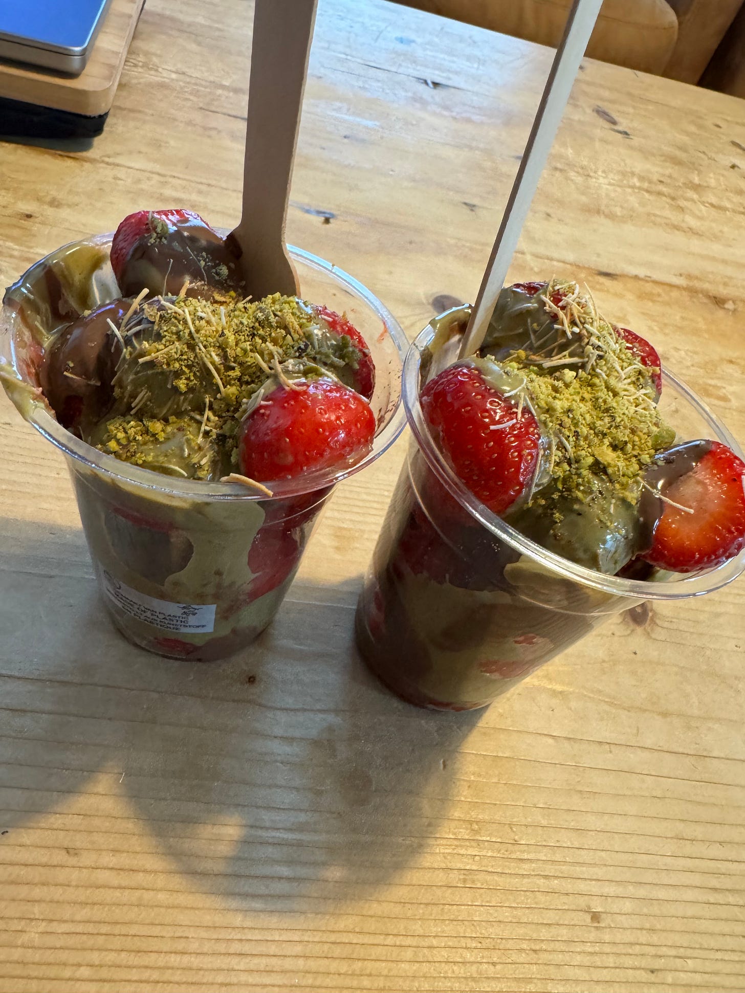 Zoals de Dubai-pistache-aardbeienbeker. Dat is onze favoriet. Een grote beker, gevuld met aardbeien met daarover (en onder, en tussen, óveral) heerlijke gesmolten chocolade met künefe en pistachenootjes bovenop. Echt, om van te watertanden.